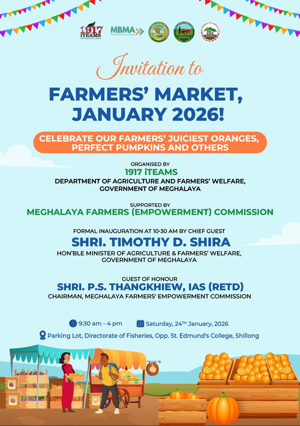The event will be formally inaugurated at 10:30 AM by Shri Timothy D. Shira, Hon’ble Minister of Agriculture & Farmers’ Welfare, Government of Meghalaya, with Shri P.S. Thangkhiew, IAS (Retd), Chairman, Meghalaya Farmers’ Empowerment Commission, as the Guest of Honour. The market will be held on Saturday, 24th January 2026, from 9:30 AM to 4:00 PM at the Parking Lot, Directorate of Fisheries, opposite St. Edmund’s College, Shillong.