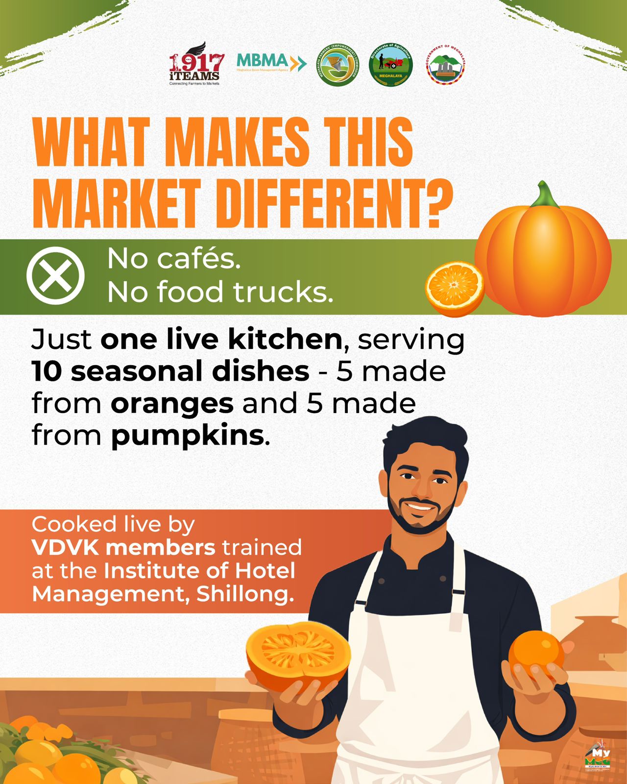 • Unique Experience: No cafés or food trucks—just one live kitchen serving 10 seasonal dishes (5 orange-based and 5 pumpkin-based), cooked live by VDVK members trained at the Institute of Hotel Management, Shillong.
